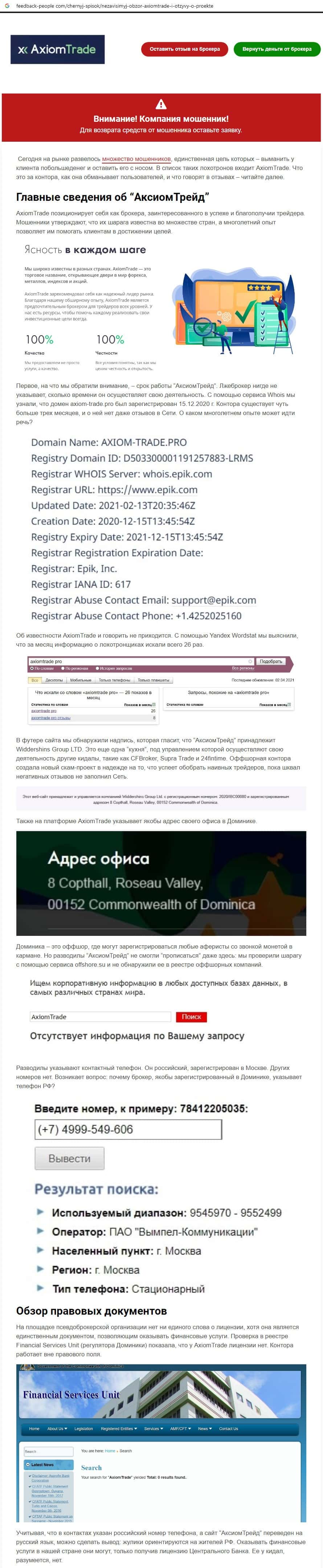 Axiom-Trade Pro - еще одна мошенническая организация, которая под видом предоставления брокерских услуг обманывает людей на деньги, судя по отзывам пользователей жулики заманивают в свою контору названивая по телефону и вешая лапшу на уши о невероятной прибыли, шулера Аксиом Трейд, как и большинство аналогичных компаний, зарегистрированы в оффшоре на острове Доминика. Обходите стороной и не вкладывайте свои денежные средства на сайте псевдо-брокера AxiomTrade !!!