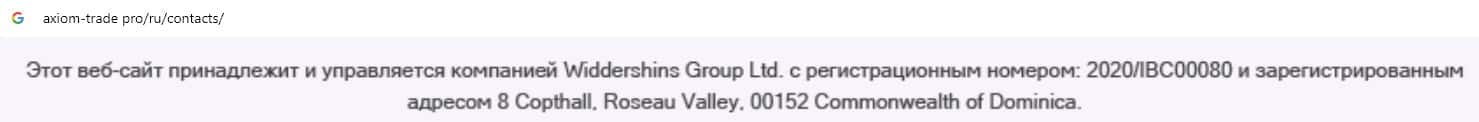 Юридическое лицо Widdershins Group Ltd владеет мошенническим интернет-сервисом axiom-trade pro, компании Аксиом Трейд, у которой оффшорная регуляция.