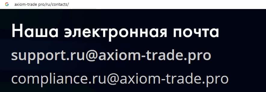 Обманщики Аксиом Трейд на своем официальном интернет-сервисе указывают два адреса электронной почты, а именно: