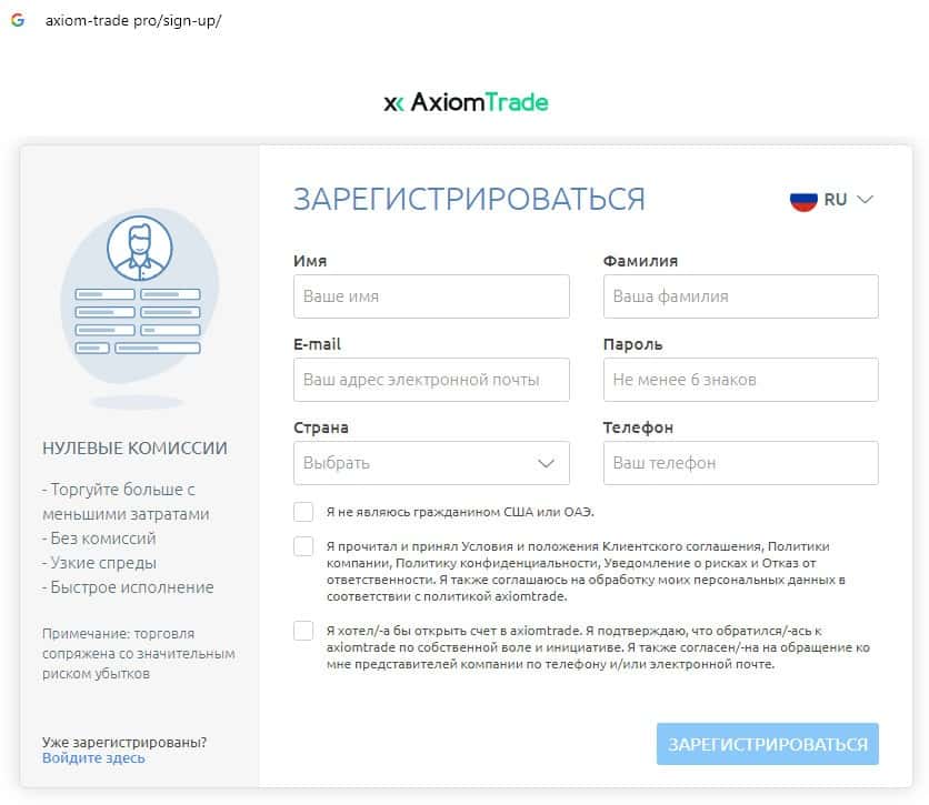 Шулера Аксиом Трейд предлагают пользователям заполнить бланк сбора данных, где просят указать свое имя, фамилию, адрес электронной почты, страну проживания и номер телефона.