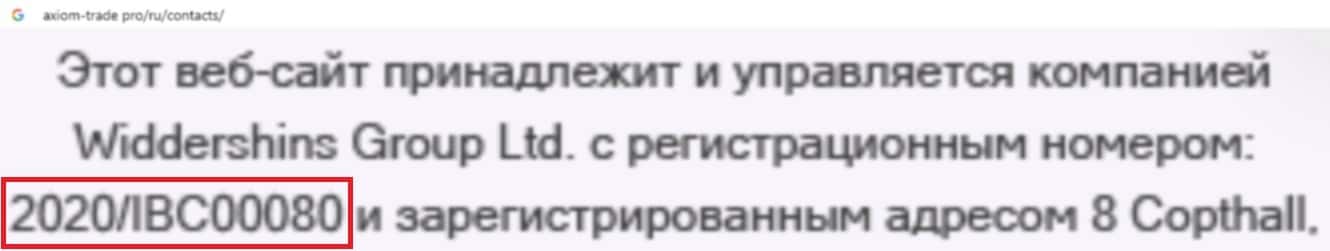 На своем официальном сайте жулики Аксиом Трейд предоставили вероятно вымышленный регистрационный номер своей конторы, который представлен на скриншоте ниже.