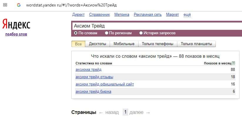 Количество брендовых запросов названия компании на русском языке "Аксиом Трейд" на wordstat yandex ru составляет 88 показов за месяц.