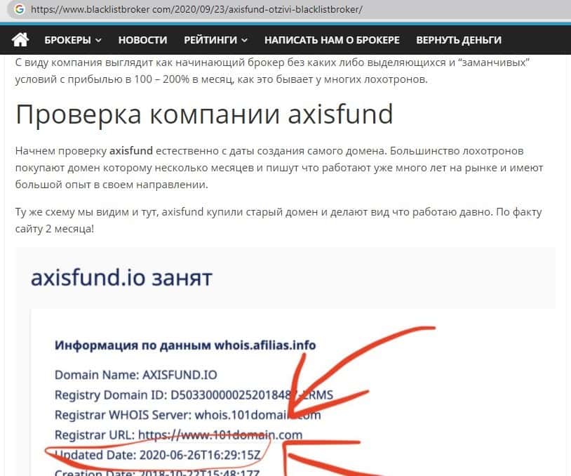 Данные про возраст домена лохотрона AxisFund io