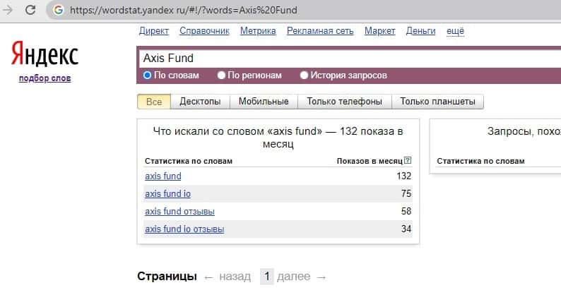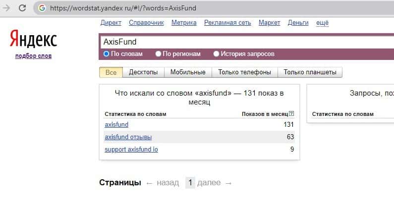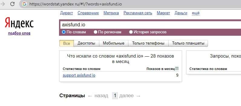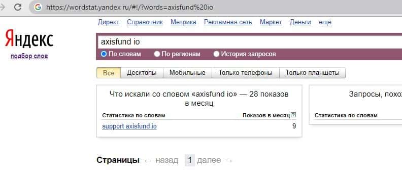 - Информация по запросам бренда Аксис Фонд на сайте яндекс