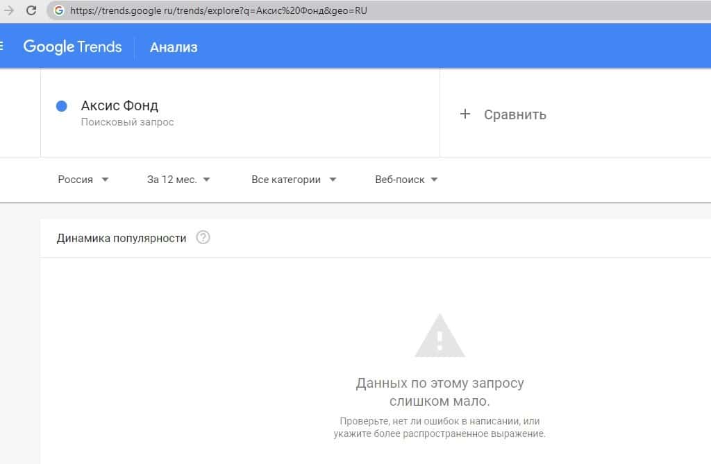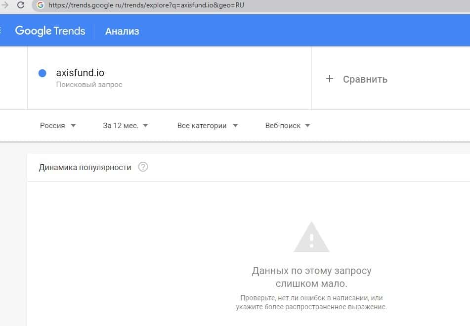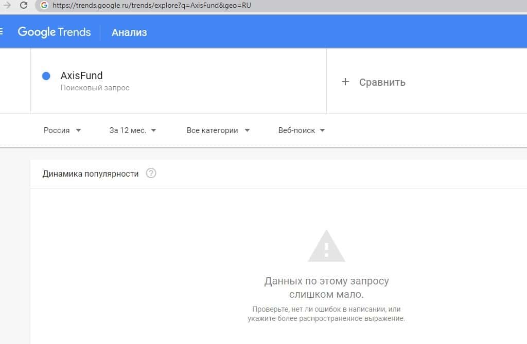 Нет популярности у запроса по бренду "AxisFund" на портале google com, так как данный бренд зарекомендовал себя не с самой лучшей стороны и потерял доверие.