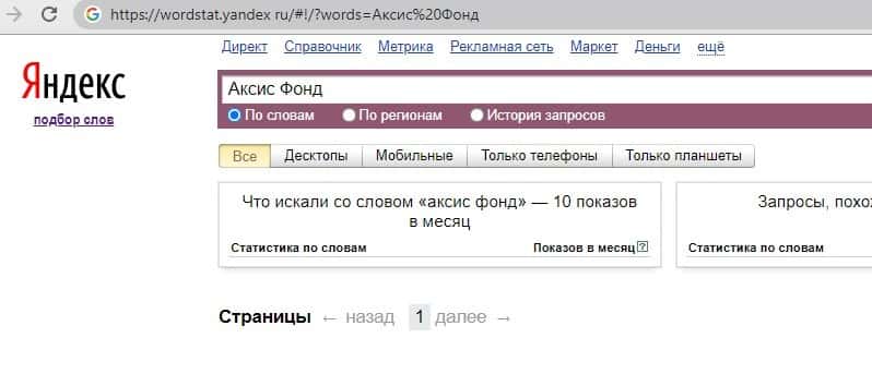 Информация по запросам бренда Аксис Фонд на сайте яндекс