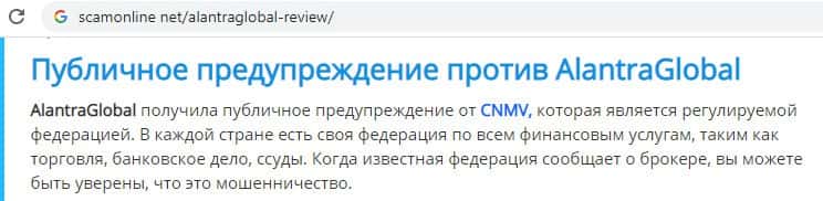 Существует в сети публичное предупреждение против Алантра Глобал, то есть регулирующая комиссия CNMV официально признала, что Алантра Глобал - мошенники!