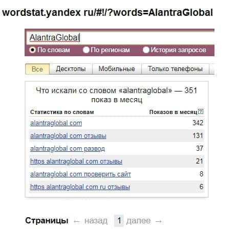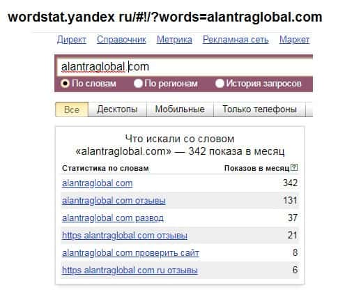 Чтобы проверить популярность контента лоховозки Алантра Глобал, делаем запрос в поиск Яндекса - название домена "alantraglobal.com". Несерьезный результат - 342 показа в месяц.