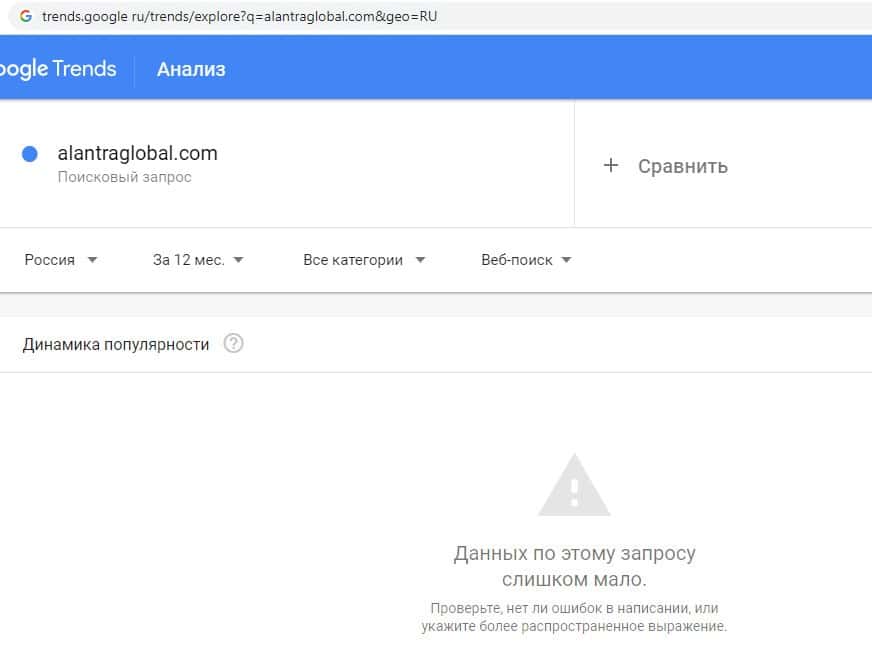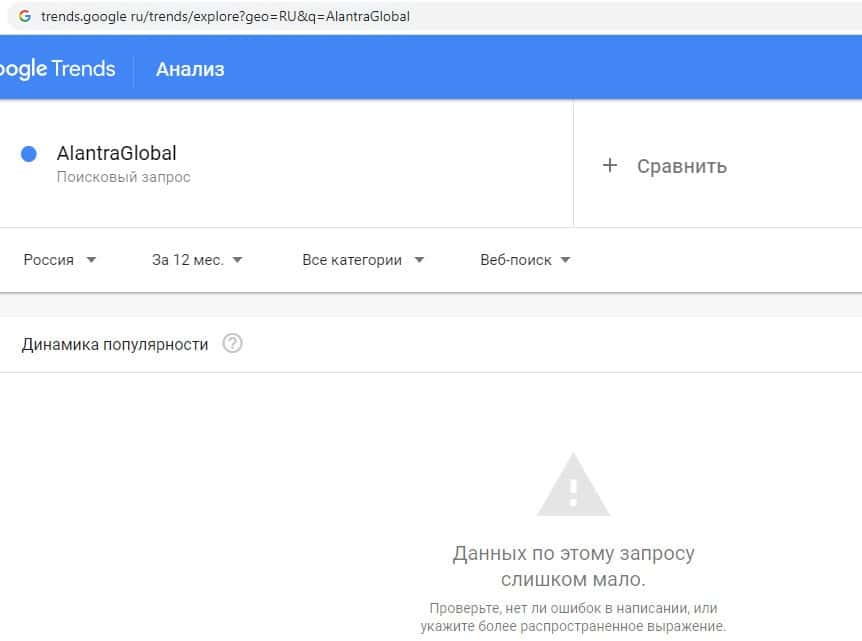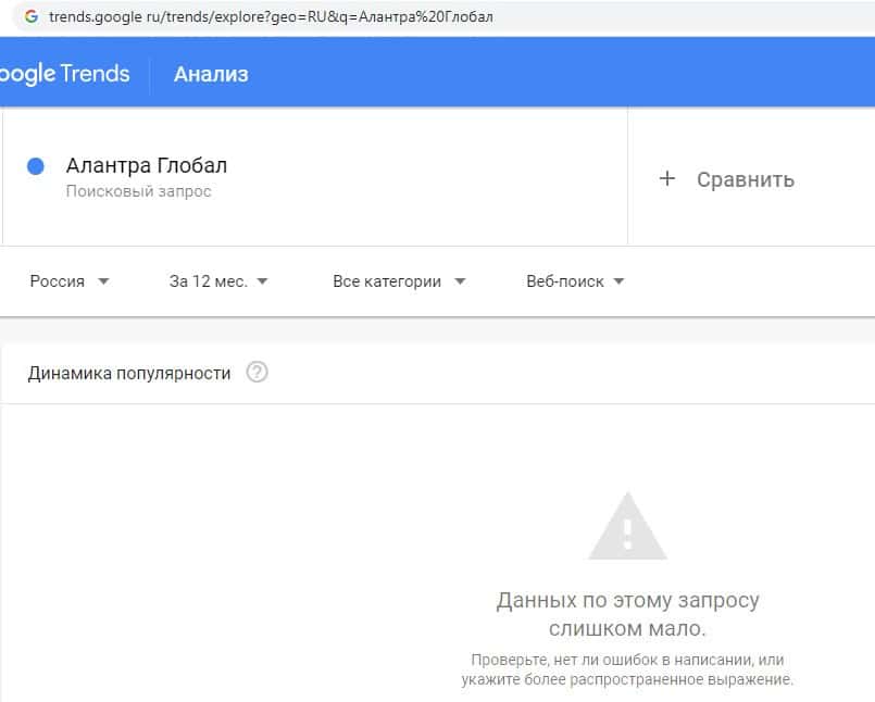 Второй вариант запроса в поиск Google: название бренда на русском языке с пробелом - "Алантра Глобал". По таком запросу также слишком мало данных и программа их не видит!