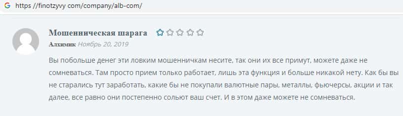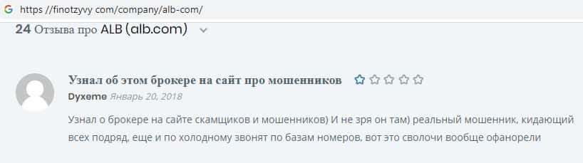 На скриншоте, расположенном ниже, Вы можете наглядно увидеть реальный отзыв от пользователя, который сообщает, что получил достоверную информацию с вполне легального и авторитетного интернет-портала скамщиков и мошенников, которые выводят на чистую воду подобных жуликов, как фальшивый брокер АЛБ, который указан на данном веб-сайте.