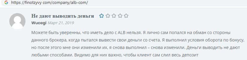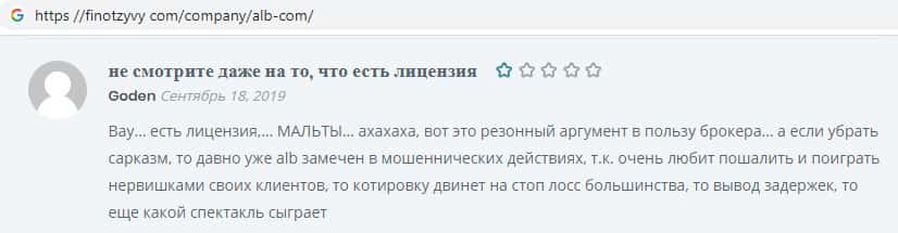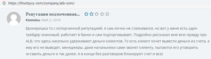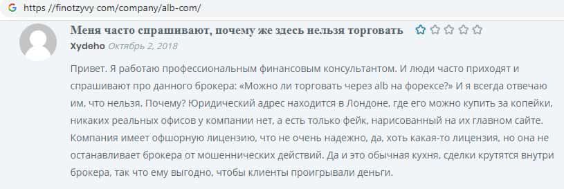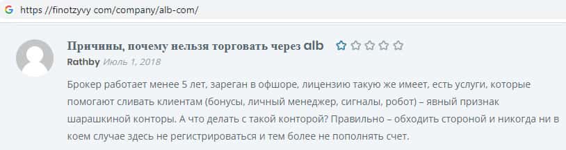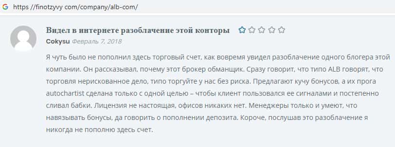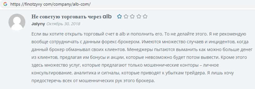 - Отзыв финансового консультанта о необходимости избегать сотрудничества с лживым брокером ALB