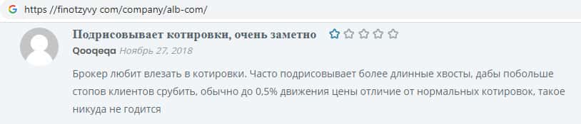Клиент сообщил в своем отзыве о том, что жульническая форекс компания ALB влезает постоянно в котировки, подрисовывает более длинные хвосты, дабы побольше стопов клиентов срубить, обычно до 0,5% движения цены отличие от нормальных котировок. Бывший клиент этого лохотрона предостерегает открывать счет у брокера-проходимца АЛБ.