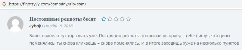 На картинке, расположенной ниже, можно ознакомиться со сведениями, касающихся всех минусов торговли на форекс рынке из-за надувательского дилера ALB. Трейдер жалуется на постоянные реквоты, изменение цен при открытии ордера. В итоге, люди постоянно остаются с носом и обмануты.