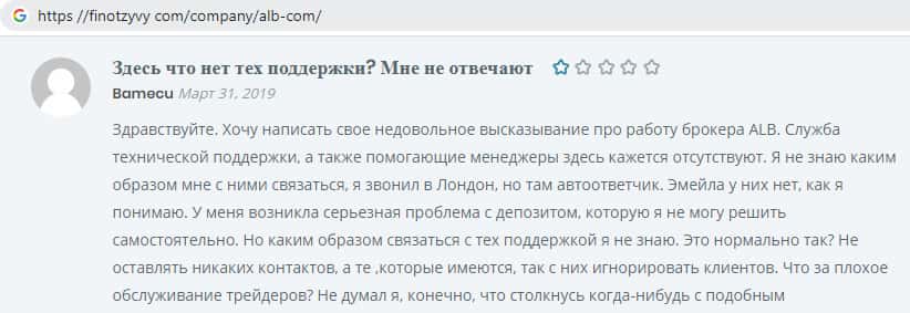 На нижнем изображении можно ознакомиться с отзывом недовольного клиента об ужасающей некомпетентности и непрофессиональной работе технической поддержки лживого брокера ALB, который в связи с возникшей проблемой со счетом пытался всячески добиться связи, но все письма и звонки были проигнорированы, что подтверждают и другие пользователи.