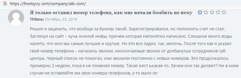 На изображении, расположенном ниже, Вы можете убедиться в реальности отзыва от еще одного недовольного клиента сотрудничеством с жуликами из брокерской конторы ALB. Мужчина рассказал, что после указания своего номера телефона сотрудники мошеннической шараги АЛБ начали его так терроризировать, что человеку пришлось даже сменить номер.