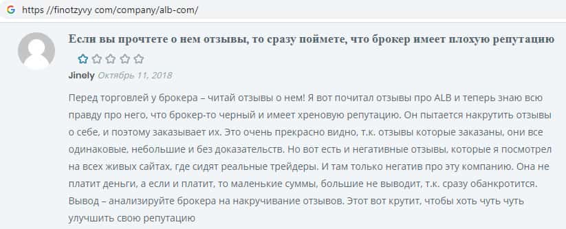 - Махинаторы из псевдоброкерской организации АЛБ накручивают себе отзывы на финансовых площадках