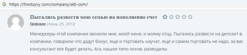 В следующем отзыве мужчина рассказывает о попытке сотрудников махинаторской форекс компании ALB. Работники данной шараги пытались развести всю семью, названивая постоянно, на депозит в компании, говорили что дадут бонус, еще и торговать научат, еще и самим торговать не надо. В общем, лучше просто класть трубку, если слышите этих лохотронщиков.