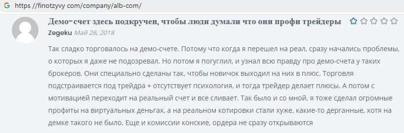 На картинке, расположенной ниже, парень поделился своей историей о том, как обманывают своих клиентов сотрудники шарашкиной компании ALB. При переходе новичка-трейдера на реальный счет с демо-счета моментально начинаются проблемы: слив средств, огромные комиссии, ордера не открываются. Лохотрон, одним словом.