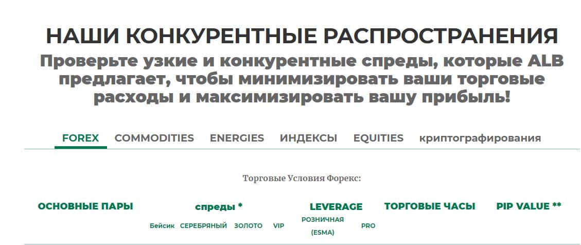 Двигаясь по веб-сайту махинаторской форекс компании ALB мы попадаем в раздел, посвященный тому, что данный лживый брокер предлагает своим трейдерам наиболее узкие и конкурентные спреды, который позволят минимизировать торговые расходы и максимизировать прибыль. А, по факту, это просто уловка для обогащения воровского форекс дилера АЛБ.