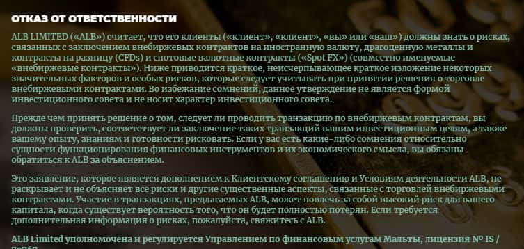 Заканчивается же веб-сайт АЛБ совершенно стандартно, а именно разделом "Отказ от ответственности", в котором идет речь о том, что мошенники предупреждают о всевозможных рисках, которые могут повлечь за собой потерю капитала форекс игроками. В общем, эти ворюги только обворовывают своих клиентов, сливая их денежки в офшорную зону.