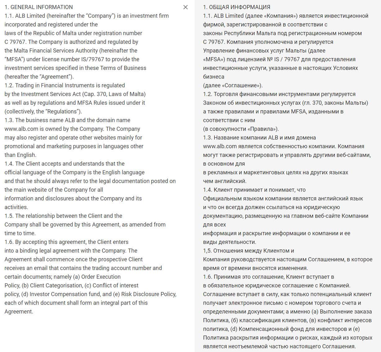 Если не быть профессионалом в составлении и подписании двусторонних договоров между компанией и клиентом, то можно очень легко попасться в сети таких обманщиков, как брокерская контора АЛБ. Если перейти к разделам и вчитаться в их суть, можно лишь ужаснуться предприимчивости жуликов из этой псевдоконторы.