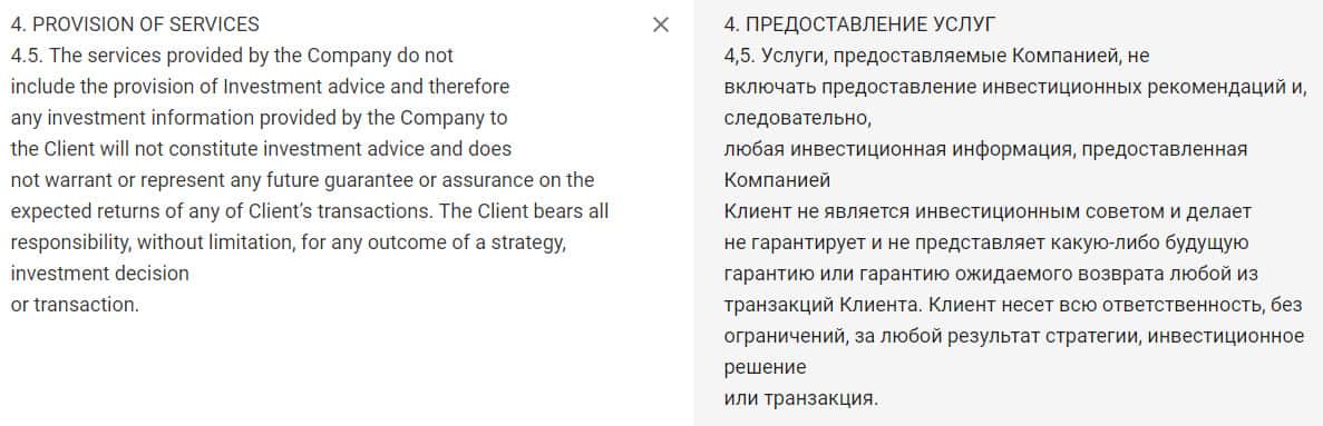 Достаточно интересный следующий раздел четвертый "Предоставление услуг", в 4-м пункте которого идет речь о том, что форекс дилер ALB по факту ни за не несет ответственности, не предоставляет своему клиенту никакой гарантии. Зато клиент несет всю ответственность, без ограничений, за любой результат стратегии. Выходят какие-то рабские и нечестные отношения.