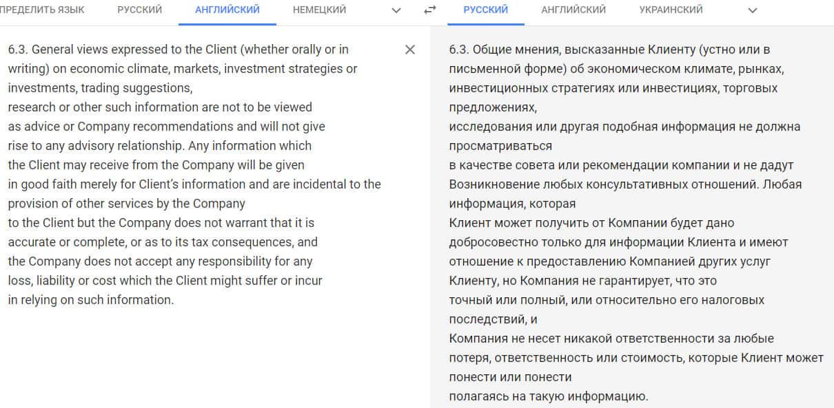 В пункте 6.3. клиентского соглашения говорится о еще одном наглом кидалове форекс игроков аферистами из псевдоброкерской конторы АЛБ по поводу того, что информация, которую клиент черпает от брокера является лишь рекомендательной и никаких гарантий они не несут за потери и риски, которые могут ожидать из-за этого несчастные трейдеры.