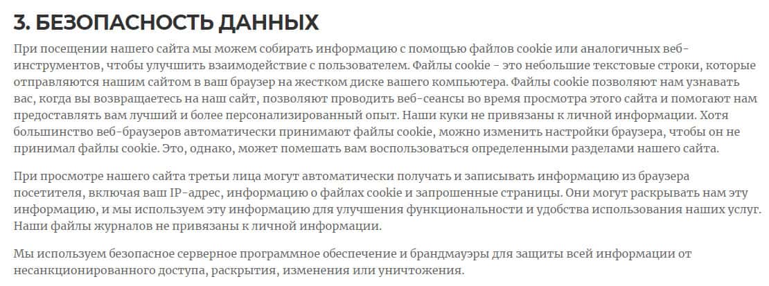 Затем ворюги рассказывают в III разделе "Безопасность данных", что третьи лица могут автоматически получать и записывать информацию из браузера посетителя, включая IP-адрес, информацию о файлах cookie и запрошенные страницы. Под этим явно скрывается хитрый замысел слить Вашу информацию в неизвестные источники.