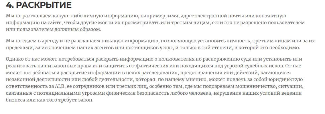 И в итоге махинаторы из жульнической организации ALB в основном из последних разделов "Раскрытие" рассказывают о том, что они не будут разглашать личные данные о своих клиентах. Но на самом деле, судя по отзывам несчастных форекс игроков эти злодеи сливают сведения левым источникам, имея с этого неплохие денежки. В общем, сплошной разводняк.