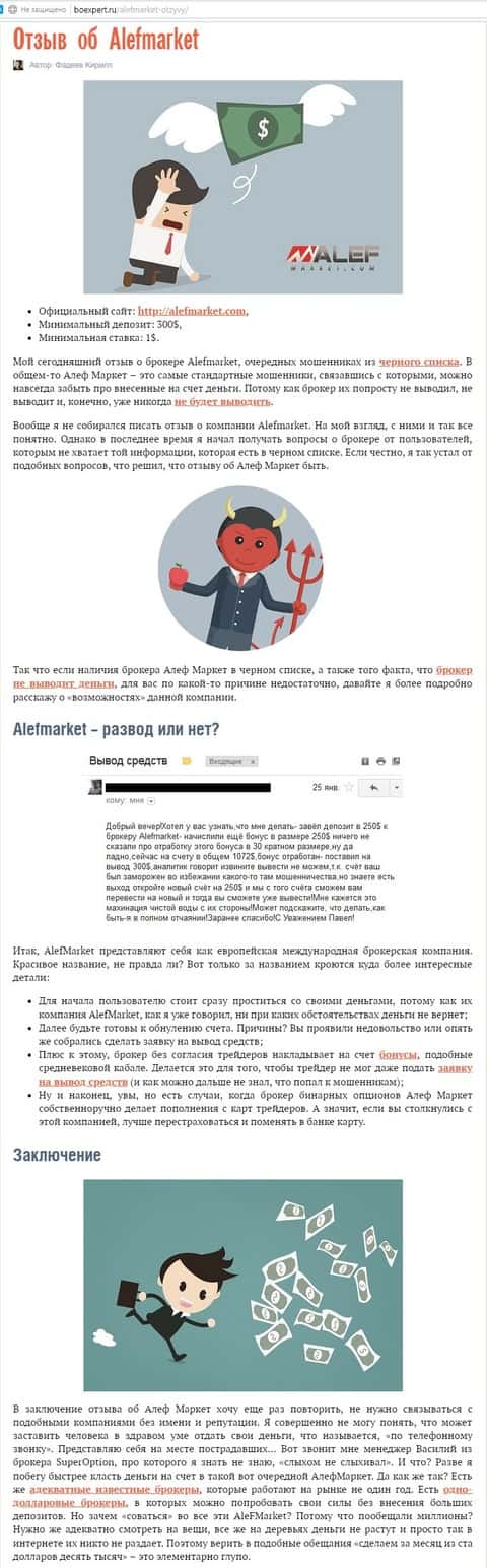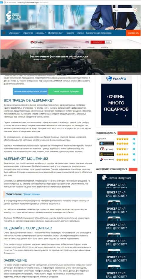 Как мы можем видеть контора Алеф маркет, успела наработать себе репутацию черного брокера и про не стали писать обзоры, как о мошеннике в сети интернет. Из следующего информационного материала, размещенного на сайте binary-options-uneversity ru, мы можем увидеть как выглядела дилинговая кухня Alefmarket до своего полного схлопывания.