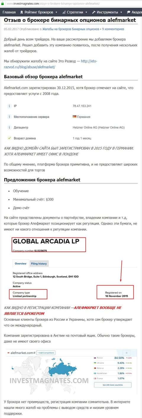 И в заключении хочется поставить жирную точку о деятельности конторы Алеф маркет статьей-обзором с сайта investmagnates com. Здесь четко указано, что бинарная кухня не имела никакой лицензии на ведение своей деятельности и по документам не являлась брокером. Жулики также предпочтительно облапошивали население Российской Федерации, хотя сами позиционировали себя как компания из Лондона.