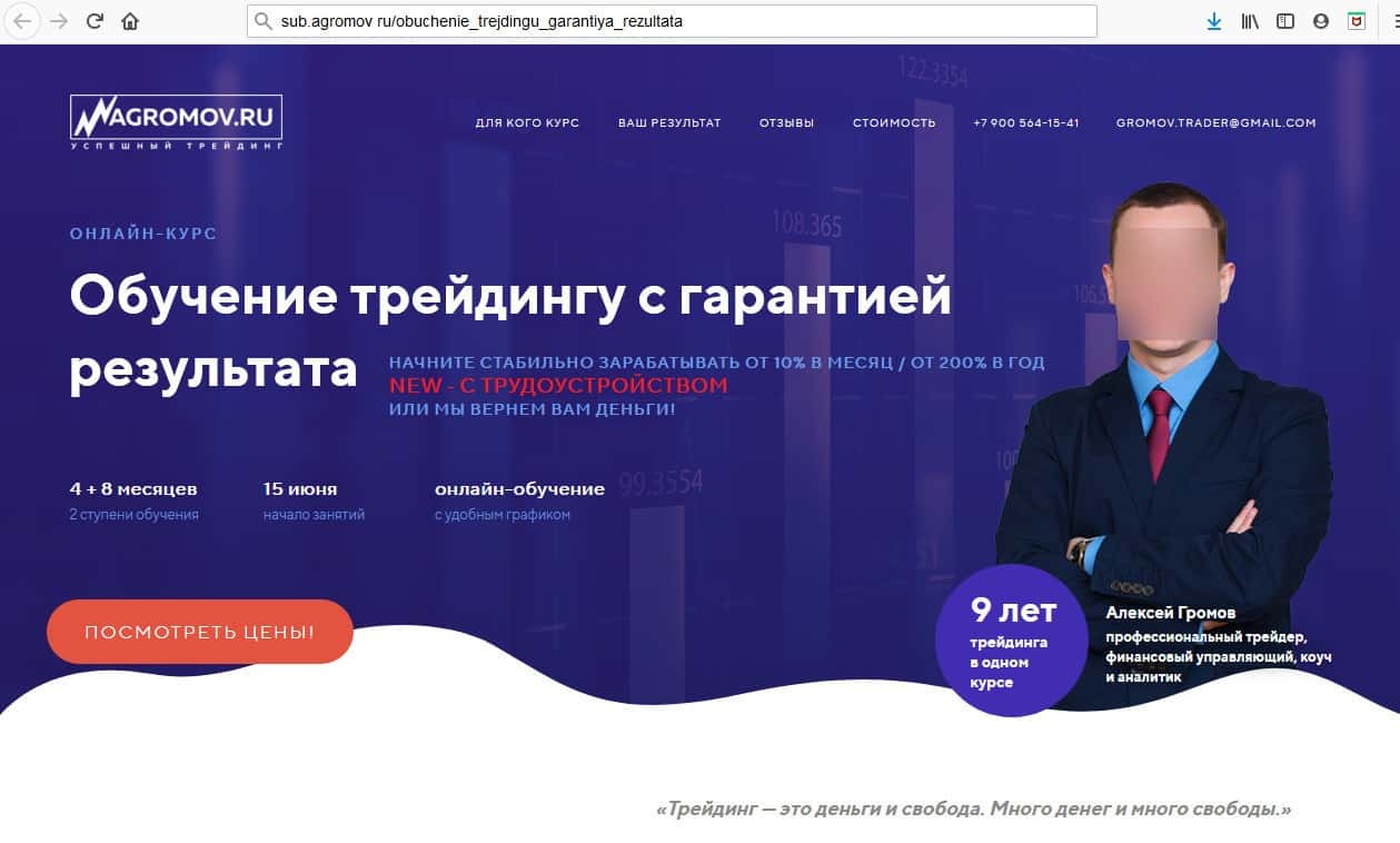 AGromov Ru - очередная школа трейдинга, где предлагается клиентам свои курсы с внимание "ГАРАНТИЕЙ" результата. ПОЛОЖИТЕЛЬНЫЕ ОТЗЫВЫ про якобы качественное обучение являются ЗАКАЗНЫМИ !!! Уже есть прямые жалобы от пострадавших на сайт AGromov Ru, поэтому денег никому не давайте - кругом одни мошенники !!!