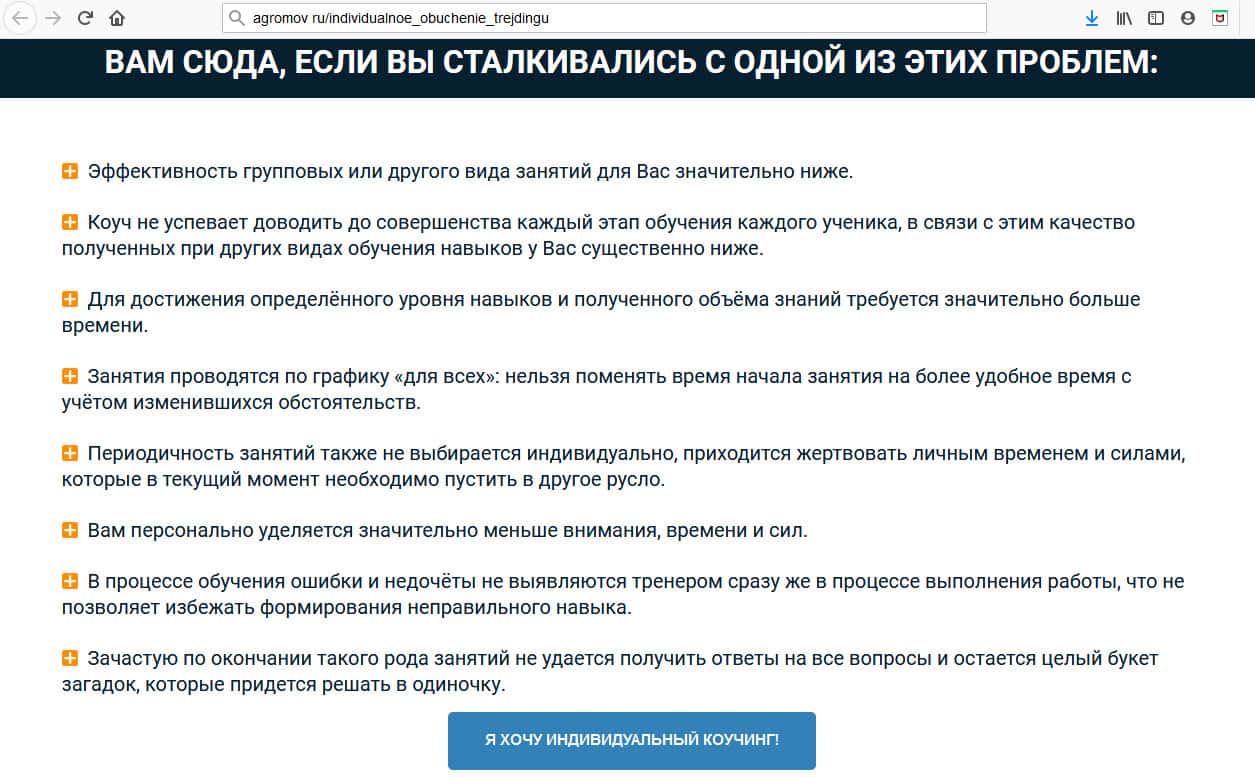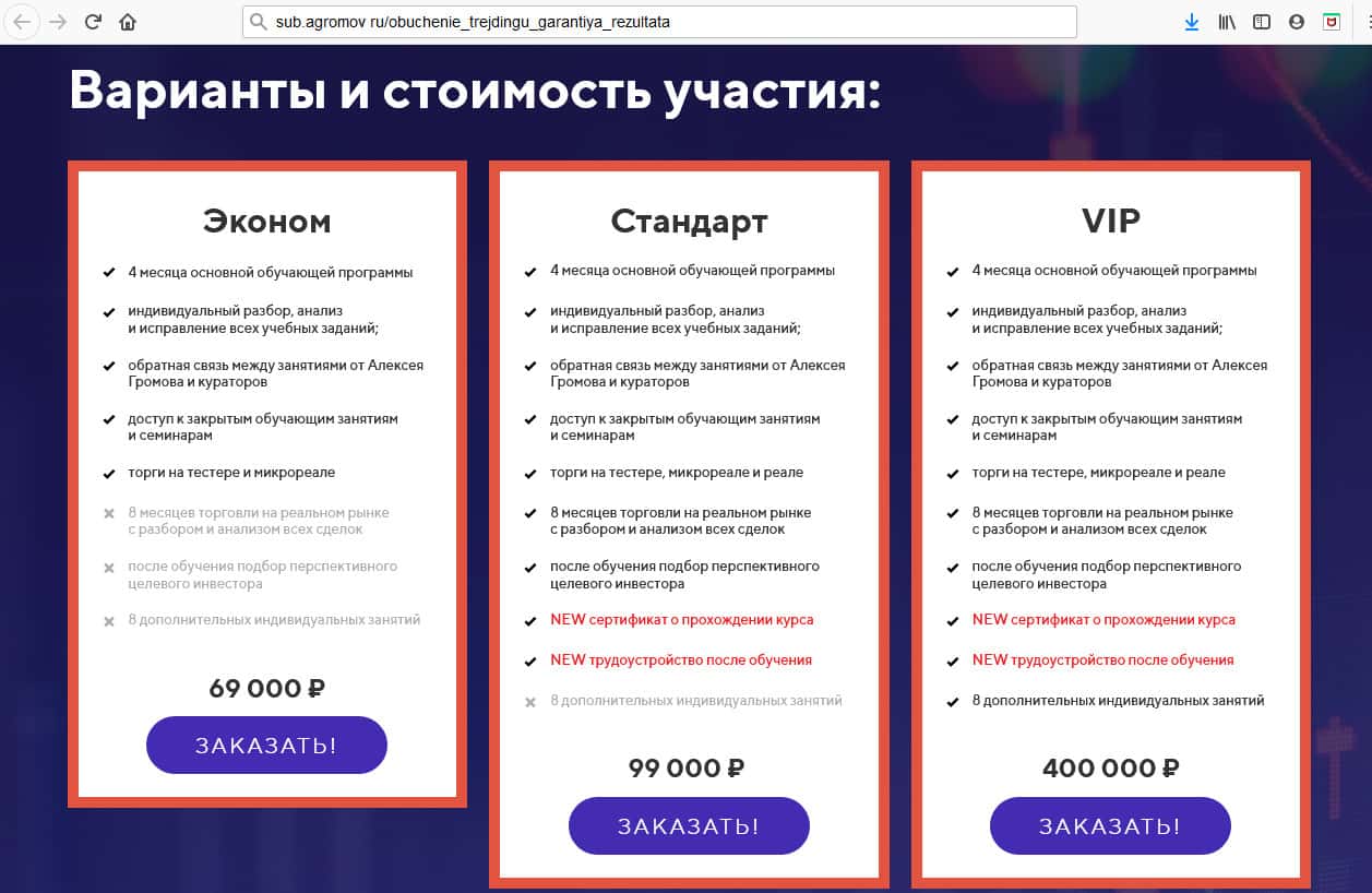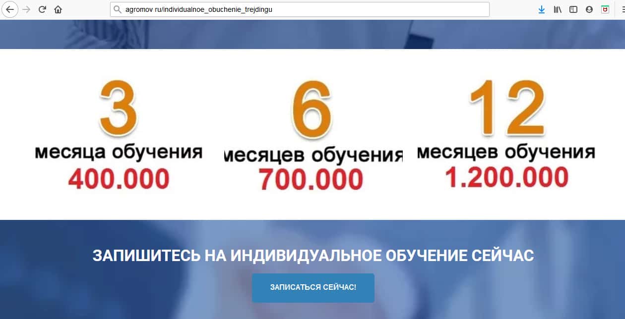 Но школа трейдинга AGromov Ru не стоит на одном месте. Они запустили еще и индивидуальное обучение с гарантией результата. Только без возврата денег в случае его отсутствия. И вы прекрасно понимаете, какой % отсутствия результата в итоге будет. Тот же самый разводняк, что и обучение, но только за гораздо большие деньги.