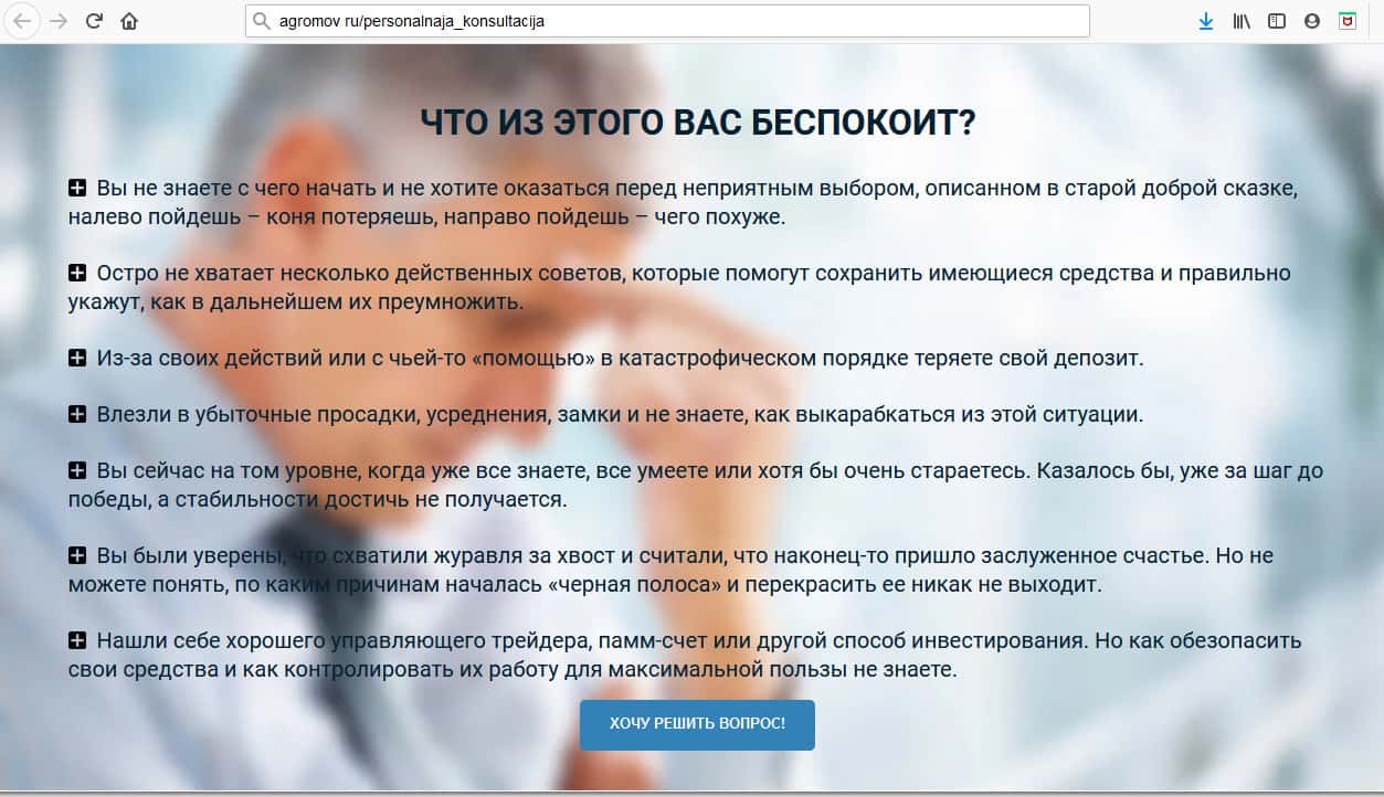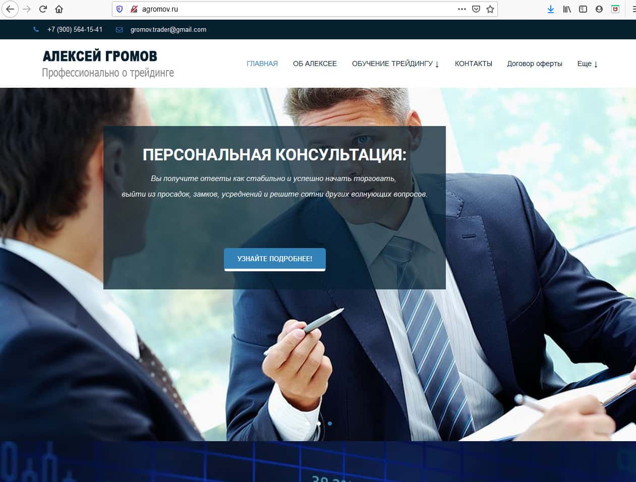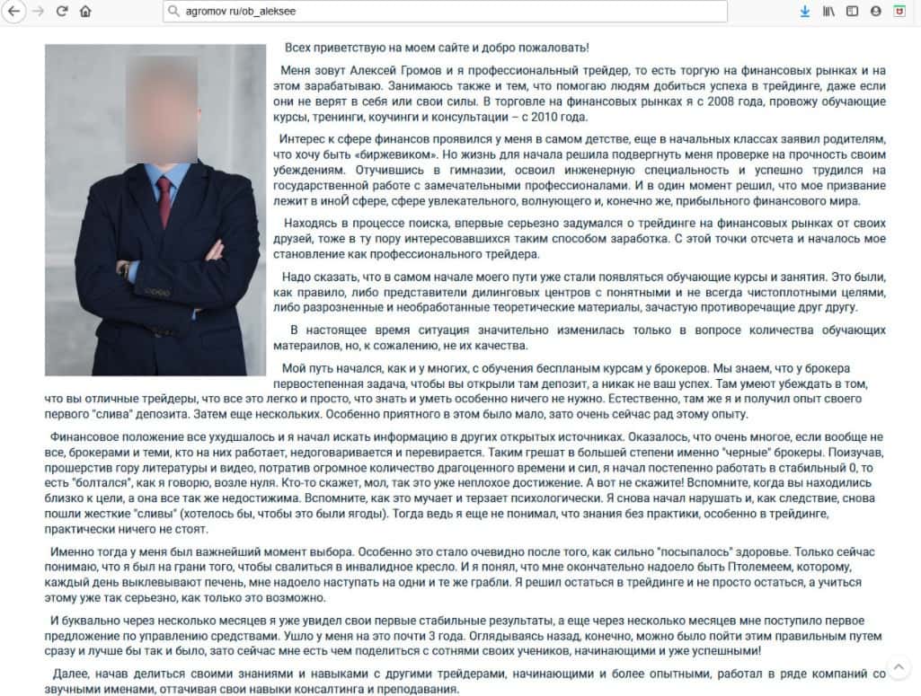 Сами о себе на сайте AGromov Ru пишут, что торгует с 2008 года, а консультации дает с 2010. Хм... За 2 года и уже такой профессионал? Где тогда подтверждение его слов, кроме громких заявлений на своем сайте? Их нет. У людей уходят десятилетия, чтобы добиться результатов. Понятно, что основной его деятельностью было консультирование, а не торговля.