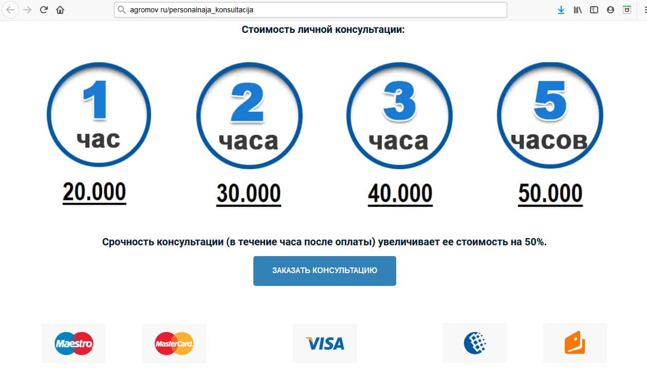 AGromov Ru не останавливается на достигнутом и помимо всех остальных "ништяков" еще запускает и индивидуальные консультации. Один час работы с ними стоит всего лишь 20 000 рублей. Ввиду отсутствия результата в будущем - это просто "мелочи". И это только час...