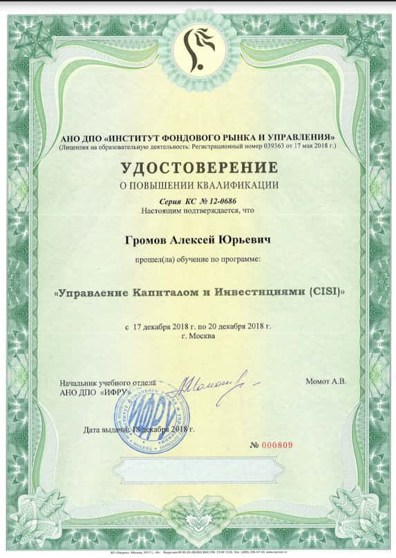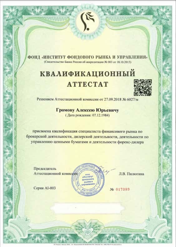 Что касается лицензий, то тут AGromov Ru не скупился, чтобы их получить. Только вот это вовсе не лицензия Центробанка, как вы могли подумать, а всякого рода квалификационные аттестаты. Поэтому они не дают вообще никаких гарантий того, что вас не обманут. Первый - это аттестат института фондового рынка.