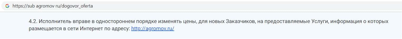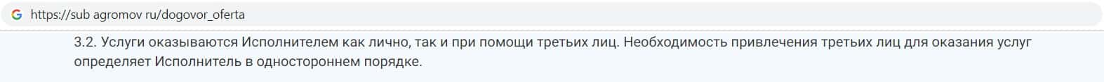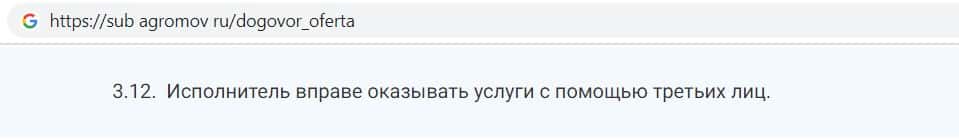 Так же компания AGromov Ru указала, что она имеет право оказывать услуги клиентам с помощью третьих лиц, которые в свою очередь могут оказаться мошенниками.