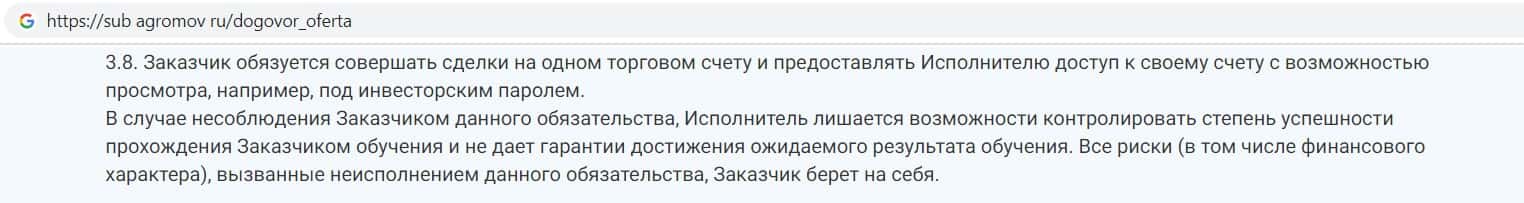 В свой договор контора AGromov Ru внесла пункт, где указала, что клиент компании обязан предоставить доступ фирме к своему торговому счету, якобы чтобы фирма могла наблюдать.