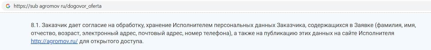 Политика конфиденциальности AGromov Ru ровно как и договор не дает вам никаких гарантий того, что ваши персональные данные не будут переданы в руки третьим лицам. Даже наоборот, дельцы со большей вероятностью это как раз и сделают. А вам потом начнут поступать звонки с дебильными предложениями от разных брокеров-мошенников.