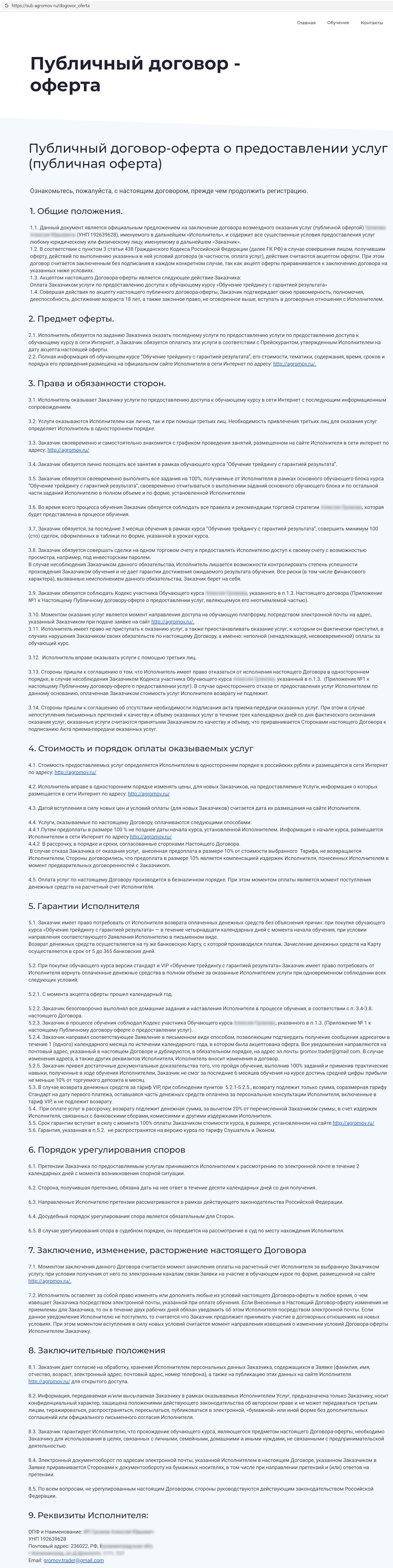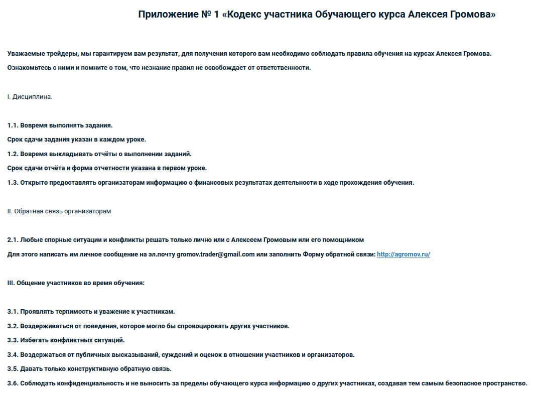 Договор Алексей Громов со своими клиентами заключает. Только вот в виду отсутствия у него лицензии на ведение брокерской деятельности, это никак не защитит вас и не дает вам вообще никаких гарантий того, что вас не обманут в один прекрасный момент. Так что это договор вообще не имеет никакой силы.