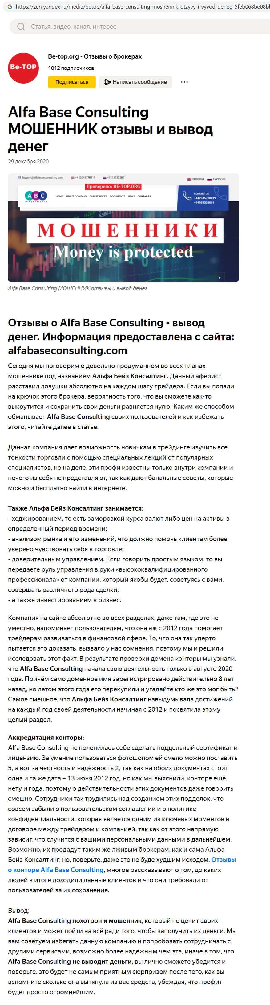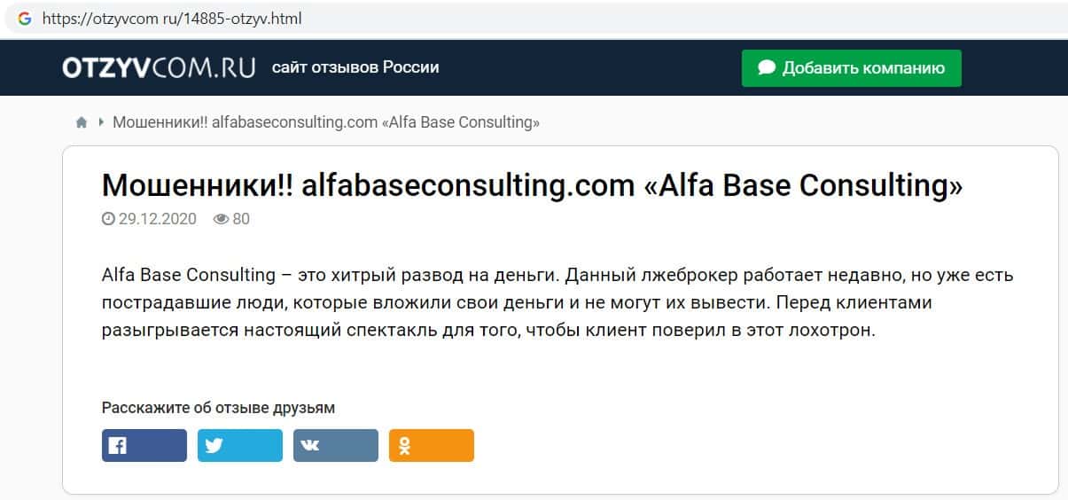 О мошенниках Альфа Бейс Консалтинг отозвался и сайт otzyvcom ru, который рассказал, что фирма является откровенным разводом на деньги, так как жулики врут клиентам.