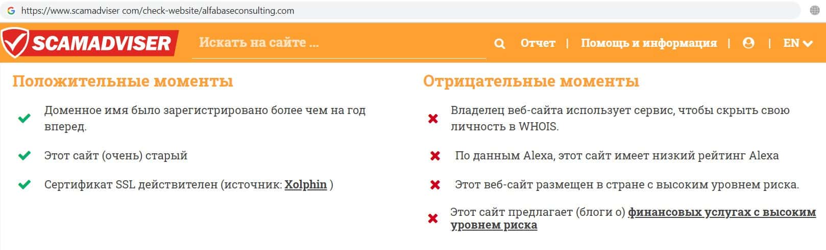 Мнение интернет ресурса scamadviser com о мошеннической конторе Альфа Бейс Консалтинг