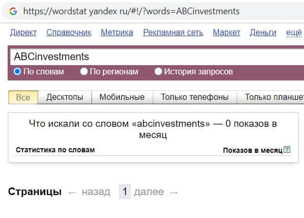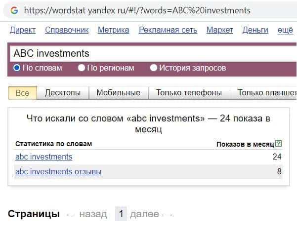 Мы проверили количество запросов фирмы ABC investments в Яндексе по названию конторы, а именно "ABC investments". 24 раза пользователи выполнили данный запрос.