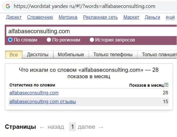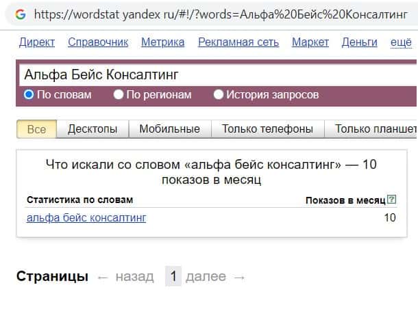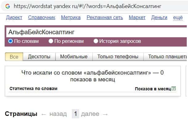 Далее мы проверили количество запросов Альфа Бейс Консалтинг по русскоязычному названию без пробелов, а именно "Альфа Бейс Консалтинг", но результата - нет.