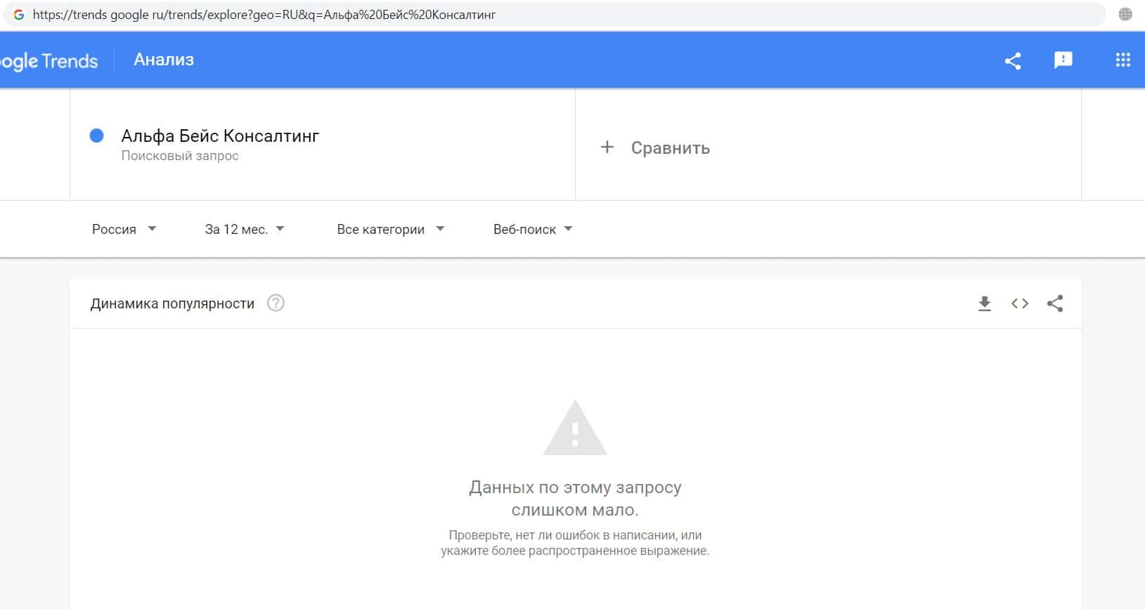 Проверили мы и количество запросов конторы ABC investments по русскоязычному названию без пробелов, а именно "АльфаБейсКонсалтинг". Но результата снова нет.
