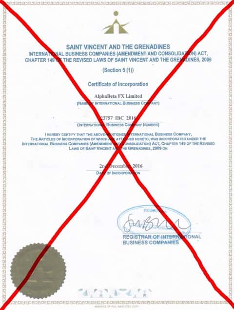 - Аферисты AlphabetaFX имеют сертификат о регистрации компании на Гренадинах и выдают ее как лицензию