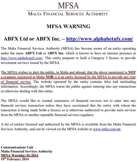 Регулятор Malta Financial Services Authority предупреждает о мошеннической компании AlphabetaFX