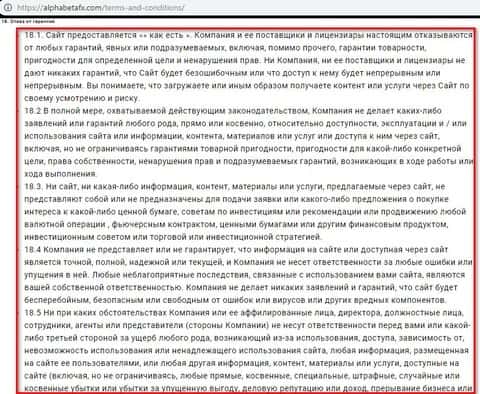 Далее следует целый раздел Отказ от гарантий, который говорит сам за себя. Согласно ему контора не несет никаких гарантий за наполнение сайта, за информацию, которую предоставляет контора своему клиенту, за какие-либо советы и рекомендации. То есть в случае чего (а это относится и к самому Клиентскому соглашению, потому что оно находится на сайте) контора Альфа Бета ФХ увиливает от ответственности и оставляет свою жертву обмана один на один со своими проблемами.