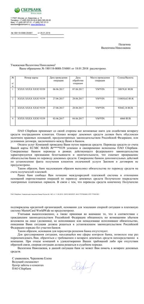 Лохотронщикам из Альфа Брокер удалось вытянуть из клиента нехилую сумму. На этот раз хапуги развели трейдера на 11000 долларов. Транзакции совершались посредством банковской карты Сбербанка. Пытаясь отсудить утраченное, мужчина обратился в компанию, которая также является жульнической – фирмачи обещают вернуть его деньги после оплаты 15 тысяч рублей.
