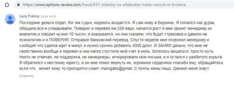 Брокерская контора Alfa Broker не пожалела даже женщину. Клиент положила на свой счет, открытый в данной кухне, 1000 долларов. Операцию она проводила через карту Сбербанк. Торговля проходила в режиме онлайн через скайп, ей помогал один из менеджеров мошеннической организации Альфа Брокер и уже через 2 месяца на счету красовалась сумма 2500 долларов. После запроса на вывод средств последовала череда отказов без объяснений. Все отморозились, на звонки и сообщения не отвечали. Женщина уже даже обратилась в Сбербанк с просьбой повлиять на данную контору, но в обратку пришло письмо, что Альфа Брокер все объяснил и претензии жертвы обмана не обоснованы, так как в договоре прописано, что она работает самостоятельно. Теперь остается только надежда, что мошенники сжалятся и вернут деньги, что маловероятно.